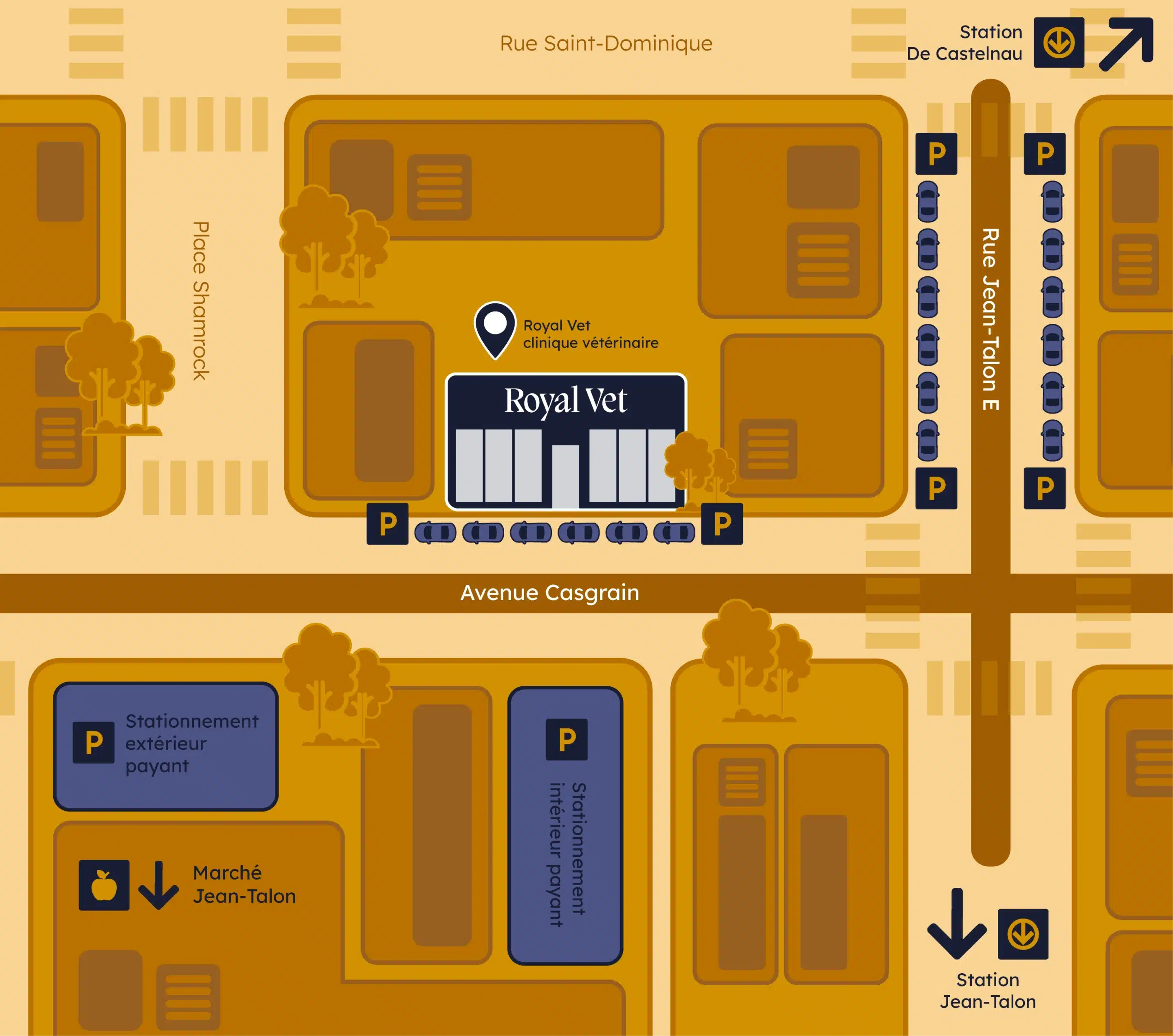 Notre clinique vétérinaire offre du stationnement sur rue, ainsi que des stationnements intérieur et extérieur situés directement de l’autre côté de la rue Casgrain, pour faciliter votre visite.